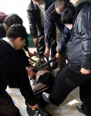 ![]() 酷刑演示图41:拽下棉裤用狼牙棒打 | ![]() 酷刑演示图42:四恶警毒打一人 |