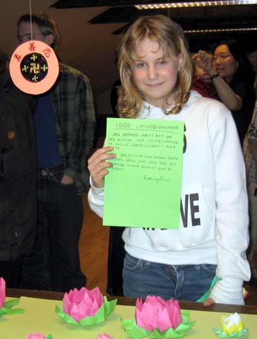 一位法轮功学员听说了这个感人的故事,对她们说:“你的梦是一个美好愿望,而这个愿望很强的时候是真能起作用的。她接着讲她小的时候是从朝鲜被领养到瑞典的。每当其生母想念她时,就叠纸鹤,因为她听说叠一千个纸鹤就能实现见到女儿的愿望。她曾经叠了一千个纸鹤,存放在一个罐子里。30年后,她们终于见面了。