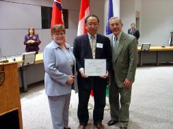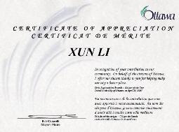 ![]() 获奖者李迅(中)同渥太华市长(右)合影 | ![]() 李迅获得的渥太华市长签发的荣誉证书 |