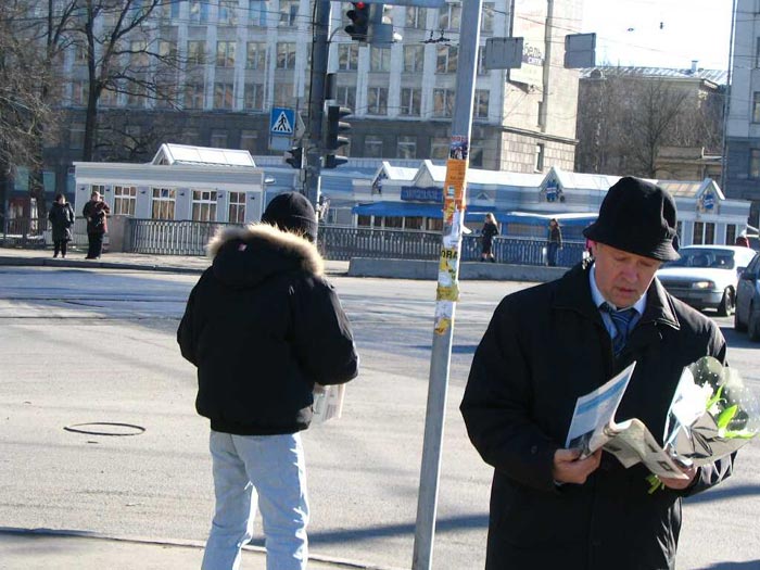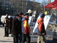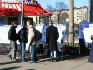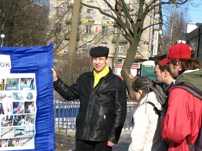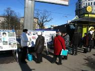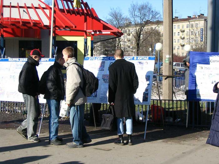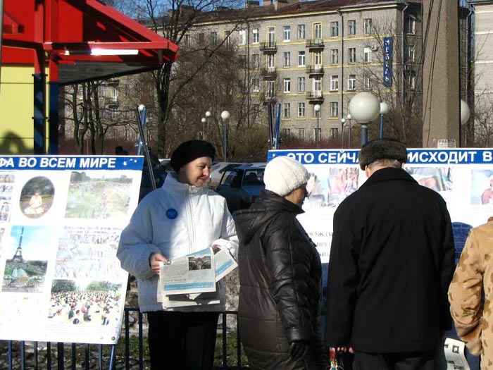 【明慧网2005年4月6日】俄罗斯圣彼得堡市法轮功学员于2005年3月26日在市区的“小黑河”地铁站附近人流量最多的十字路口举行了持续几个小时的讲真象活动。学员们把展板及横幅展示在了街道的必经之路,向过往的行人介绍法轮大法以及其洪传全世界的盛况。