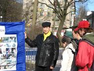 揭露正在中国发生的对法轮功及法轮功学员的残酷的图片。引来了很多路人的关注。行人看到江氏集团迫害法轮功学员所使用的残忍酷刑后都表示极大的愤慨,并且对法轮功学员表示同情。虽然人们在这匆忙的城市中只能了解到传单上的内容,但依然有很多人留下了签名表示支持法轮功,谴责在中国发生的这场迫害。