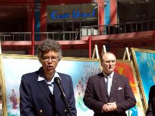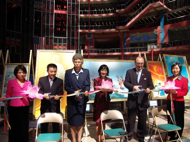 中午12点,画展开幕式正式开始,在开幕式举办的新闻发布会上,芝加哥市第四区区长托妮(Toni Preckwinkle)和库克郡第16区区委安东尼•波瑞尔(Anthony Peralca)特意赶来参加剪彩仪式。Toni Preckwinkle 说,她作为一名非洲裔美国人,深知自由和平等的珍贵,觉得也应该关注发生在别处的不平等,尤其是在中国对法轮功的迫害。托妮曾于2002年发起支持法轮功和谴责迫害的市决议案,此决议案于2002年11月6日获得芝加哥市议会全票通过。安东尼先生在新闻发布会上表示,在中美经济贸易取得初步成效的同时,中国大陆的民主及人权问题却没有改进,他不希望民主自由和人权被淹没在经济大潮之下,法轮功被迫害即证明了这一点。