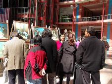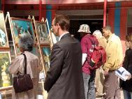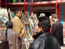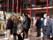 ![]() 画展开幕式上的剪彩仪式 | ![]() 人们驻足在画展前听法轮功学员的讲解 |