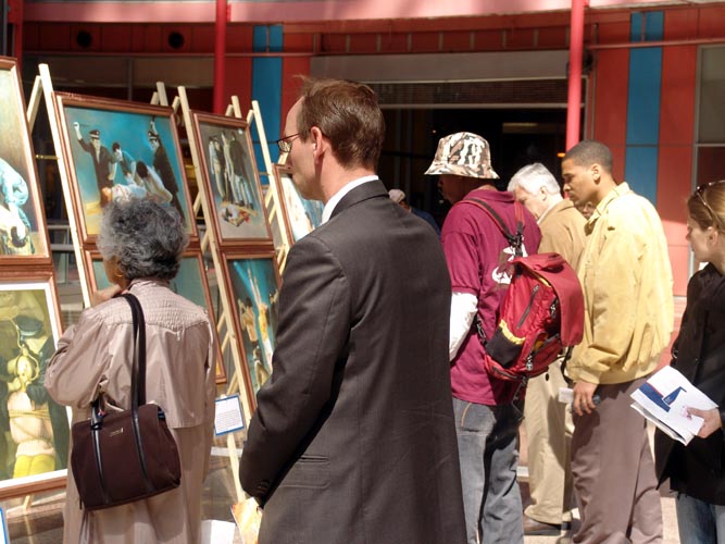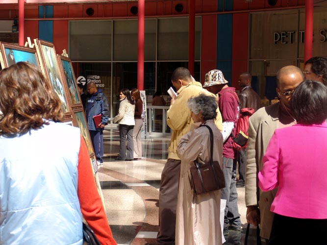由于汤姆逊中心是芝加哥的市中心,每天的上班族和游客至少数千人,人们一走进大厅,立即就被这肃穆、庄严和祥和的图面吸引住了,大部分人都停下来,仔细的观看。很多人都被迎面而来的第一幅画“誓约”所震撼。“誓约”描绘的是法轮大法弟子们浩浩荡荡的自天国而来,到人世间履行誓约和使命的故事。画面中的大法弟子们包含各个人种,黄种人、白人、黑人等等,身着各种服装,佛家的、道家的,神色肃穆而坚定。尽管观众们并不能完全理解画面的意思,可是走过的人无不惊叹:太美了!太壮观了!不少人询问价钱,想把这幅画买下来。