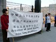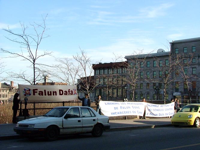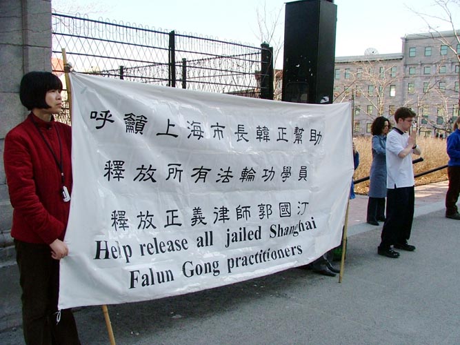 日前法轮功学员曾写信给蒙特利尔市政府,呼吁关注并请共同制止中国对法轮功的迫害。4月6日晚5时至9时法轮功学员在寒风中一直在市政厅前炼功、发资料。他们打出的横幅是:“请与我们共同制止对法轮功的迫害”;“呼吁上海市市长韩正帮助释放被关押的法轮功学员,声援正义律师郭国汀”。许多前来参加晚宴的人都接了资料,并且很理解和支持法轮功学员。