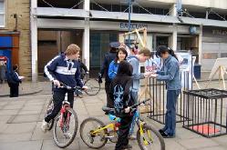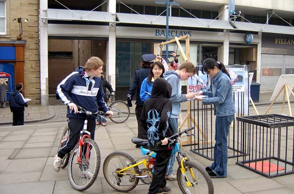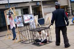 有个小女孩自己来听完真象之后又把她的妈妈从附近拉来了。接着,她又领了她的小伙伴来签名。后来又来了一大伙儿人,他们问笼子里是模型吗,如果是真人的话,老是蜷缩在小笼子里会非常难过吧?我们告诉他们是真人模拟的,并且实际情况要更严重,他们感到非常震撼,我给他们看了我们的真象杂志,这些看似调皮的小男孩儿正义感非常强,纷纷签名了。