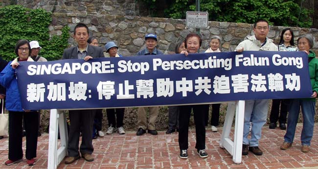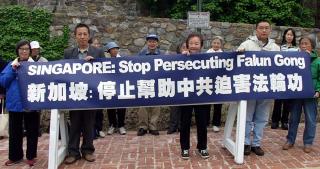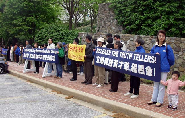 几十名华府法轮功学员静静的站在新加坡大使馆对面的街道上,并展开了印有“新加坡:停止帮助中共迫害法轮功”,“立即释放黄才华、程吕金”,“Release the Truth Tellers”等字样的中英文横幅。