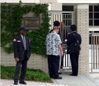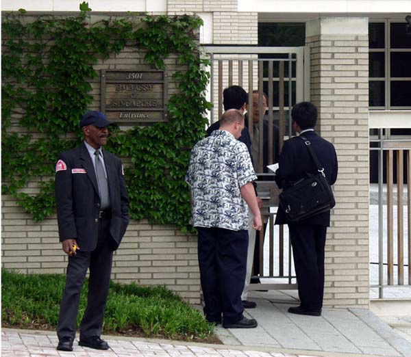 下午两点左右,新加坡驻美大使馆一秘利景志和另一名官员接见了法轮功学员代表丁先生。丁先生说,两位使馆官员一直比较紧张,一开始便不让媒体進去,而且只允许一个人進入使馆,并反复询问有没有带相机,有没有录音。