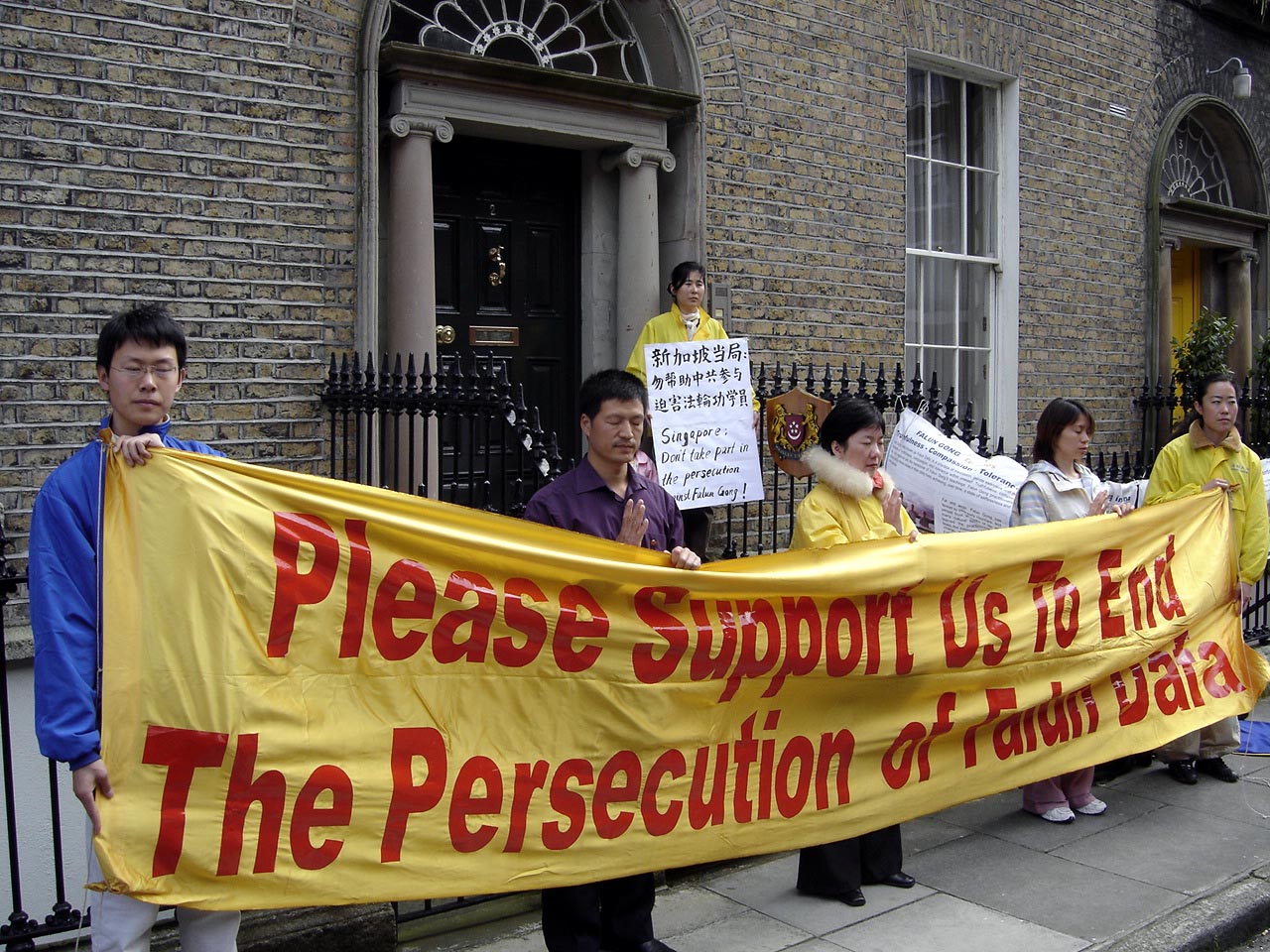 从都柏林南部赶来参加这次请愿的Lily女士说,当听到日前遭新加坡当局不公正判决的两位女法轮功学员之一程吕金自入狱后就开始绝食的消息后,深感担心。她说:自99年7•20开始中共邪恶集团迫害法轮功已经近六年的时间,国际社会对这场中共和其前总书记江泽民相互勾结利用来迫害法轮功的行为纷纷進行谴责。在这种情况下,中共也只有利用经济利益不择手段的拉拢别人来参与对法轮功的迫害。新加坡政府的选择是不理智的。