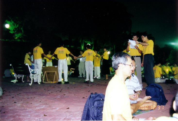 2000年底,在明慧网上刊登的被迫害致死的国内法轮功学员达到了107人,迫害情况十分严重。我们一些学员商量好在12月31日晚上举办集体烛光守夜活动,悼念被迫害致死的107位中国大陆法轮功学员。“麦里芝”是当地一个水库的名字,是新加坡旅游胜地之一。我们在几年中经常利用周末和节假日在这里进行大型集体炼功,从未被要求有准证,也从未被视为“非法集会”。