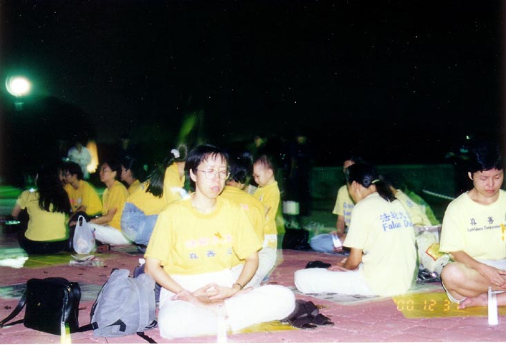 当天傍晚6点钟,大约60位学员包括小孩和婴儿,象往常一样来到麦里芝水库公园,每10个人围成一圈,静静的席地而坐,举行烛光悼念仪式,参加的人中还包括几名有亲戚因炼法轮功在中国被非法关押的学员。当时我们制作了两块展板,列出107名被迫害致死的学员照片和名字。一块板上写着 “烛光守夜”,另一块板上写着“悼念同修”等字。