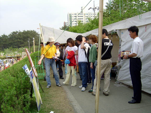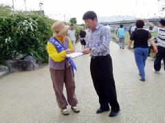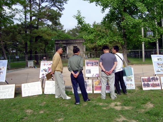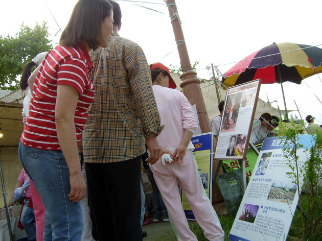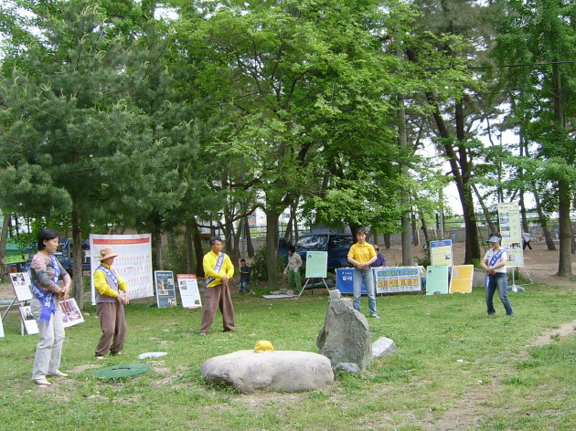 【明慧网2005年5月10日】韩国庆尚南道的代表乡土庆典“米良阿里郎大会”是每年举行4天的综合性民俗庆典,今年庆尚南道体育大会也同时举行,所以外来游客明显大增。世人云集,法轮功学员们也决不放过这样的大好机会,该地区的学员们在大会开始之前就作好了诸般准备。找到大会主办人,向他讲真象并请其允许学员们举办为营救高成女而進行的征签活动。学员们到警署作了集会申请,并讲了真象。