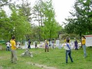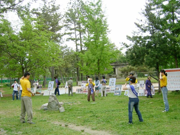 功法演示2005年4月29日到5月2日大会期间,法轮功学员们在体育馆前的树林里摆放好了图片展板和签名台。由于图片展区的前后有跆拳道和摔跤竞技场,从而可以尽情向各地的选手和游客们讲真象。悠闲的游客们在树荫下观看真象图片,听学员们的说明,他们为中共江氏集团的邪恶镇压而愤怒,而后又欣然为营救法轮功学员高成女而签下自己的名字。