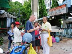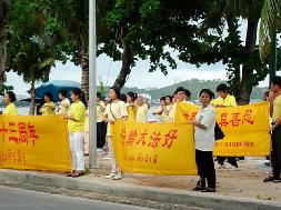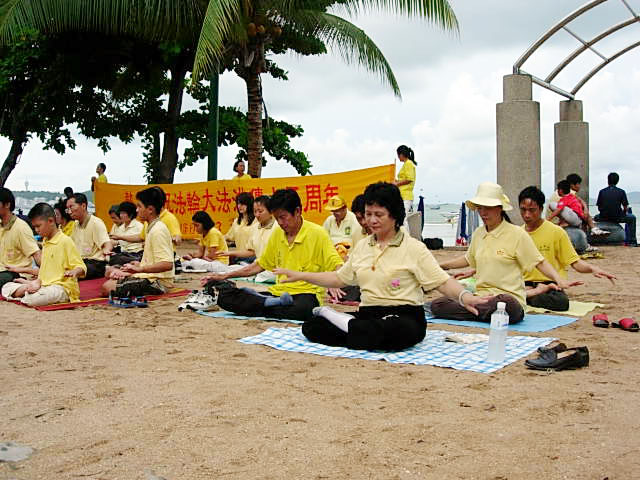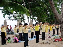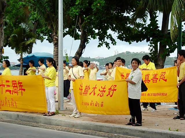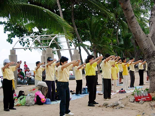 【明慧网2005年5月10日】2005年5月8日,在海风拂荡,潮声阵阵的芭提耶海滨,出现了一道不同寻常的风景,50多名身穿黄色炼功服的泰国法轮大法弟子聚集到此,打开了“热烈庆祝法轮大法洪传十三周年”的大幅标语,以及“世界需要真善忍”“法轮大法好”等横幅,在优美的音乐中,演示五套功法,发简介资料,向路人讲述法轮功真象,展示法轮大法的美好。