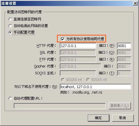 在Firefox工具栏的工具-选项-基本信息-连接设置中,选择“手动设置代理”选项后,必须选择“为所有协议使用相同代理”选项,要不然当打开Https网站时就是不通过破网软件而是直接连接的(图片见附件)。
