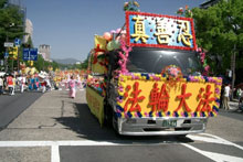 “真善忍”和“法轮大法好”的巨幅牌匾高高镶嵌在花车上,在蓝天和鲜花的烘托下,在万紫千红的法轮大法游行队伍的簇拥下,显得分外夺目,普照天地……