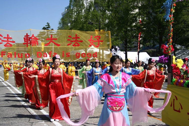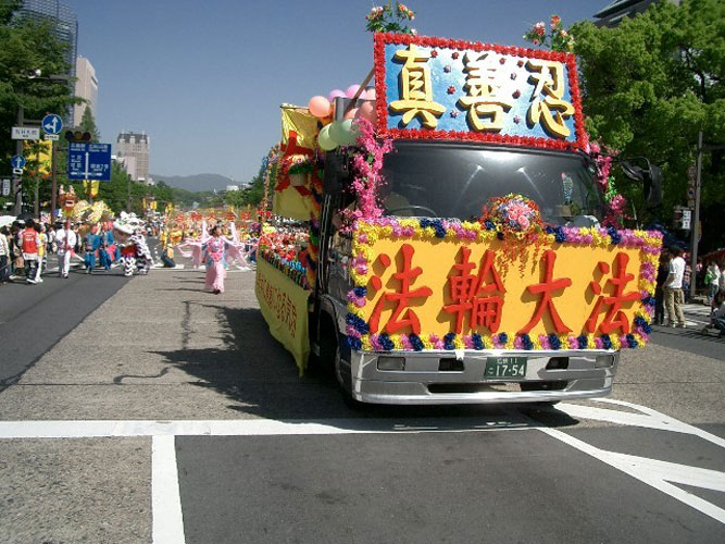 “看哪!法轮大法的队伍走过来了,他们来自日本全国各地,个个精神饱满。他们无论男女老少,不但身体健康,而且个个都是那么善良、祥和。法轮功是出自于中国的传统气功,他们以真善忍为目标,追求做一个高尚的人。今天,他们同心同德,通过展示中国文化来传达对世界和平的美好祝愿……”