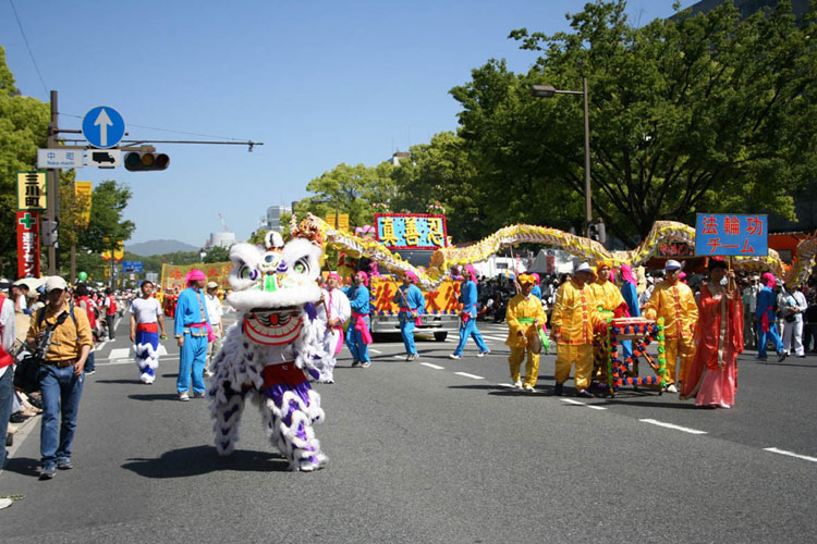 伴随着“普度”那让人既心生慈悲又深感超凡脱俗的天乐,“仙女”们翩翩起舞。“唐装仕女”们不仅展示了唐装服饰的华美和仕女们的风姿,更把大唐文化那高雅、淳厚的神韵传给了广岛市民;“腰鼓队”虽然是由男女老少组成的混合队,但当他们一踏上游行大道便顿时精神抖擞,个个神采飞扬。咚咚的鼓声铿锵有力,活泼欢快,催人奋進;在法轮大法的队伍中,一条金龙腾云驾雾,上下翻飞,时上时下,时左时右,时前时后,恰似八部天龙在守护着天上人间;与之相映成趣的是一对生龙活虎的狮子,他们左蹦右跳,摇头摆尾,欢闹嬉戏,似乎在告示人们:众生久久期待的春天就要来了……