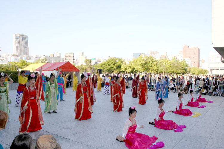 5月3日的团体游行表演,既是本盛会开场的重头戏,更是其最亮丽的看点。来自日本各地的77个团体共7100多人参加了本届游行表演,当天的观众人数达55万人,无论是参加表演的团体、人数,还是观众人数都是有史以来较多的一次。为了能一睹各路团体的精彩表演,人们早早就来到位于市中心的和平大道,把一百米宽的和平大道围了个水泄不通,人头攒动,热闹非凡。