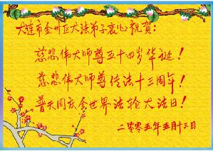 大连大法弟子敬贺世界法轮大法日!恭祝师尊生日快乐!师父,我们一定牢记大法弟子是一个整体,不忘大法弟子肩负的使命,同全世界的大法弟子们一起,更加精進修炼,讲清真象,救度众生,按照师父的要求走好正法之路,不辜负师父的慈悲苦度。