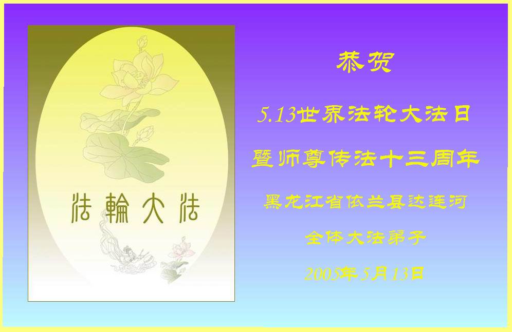在普天同庆5.13世界法轮大法日暨师尊传法十三周年的时刻,我们黑龙江省依兰县达连河的全体大法弟子向慈悲伟大的师尊致以最崇高的敬意,恭祝师尊五十四岁华诞。问候:师尊您好!您辛苦了!弟子们十分想念您!