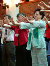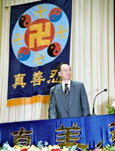 ![]() 2001年台湾法会总统贺电 | ![]() 2002年法会副总统贺电 | ![]() 吕秀莲副总统(右一)学炼法轮功功法 |
