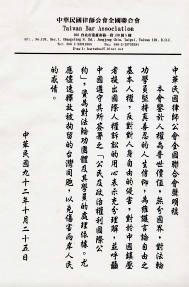 ![]() 花莲县议会祝贺全文 | ![]() 律师公会全国联合会声明支持“诉江案” |