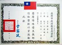 ![]() 李敏瑜获特殊优良教师奖牌 | ![]() 获奖公文 |