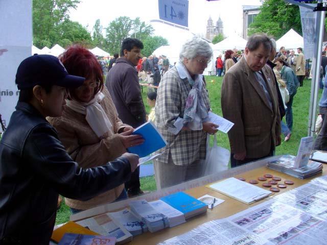 一位上了年纪的对中国文化很有了解的德国人在咨询台前逗留很长时间,表示对学员所解释的因为修炼的民众太多而导致打压不能完全接受,当学员再告诉他:共产党宣扬无神论,通过历次运动摧毁了中国的传统文化,而法轮功扎根于中国的传统文化,体现了中国传统文化的精髓,唤醒了人们的道义和良知,这是历来宣扬“假恶暴”的中共所无法容忍的,这是法轮功在中国受到残酷打压的一个主要原因,他点点头,表示心中的疑问得到解答。