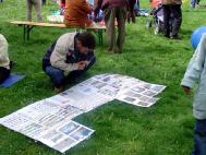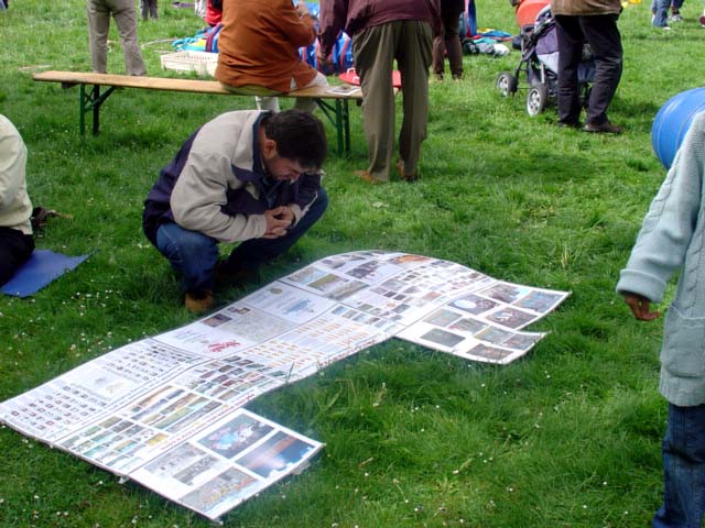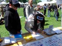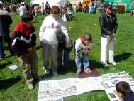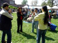 法轮功学员的信息咨询台前总有感兴趣的人前来询问,一些被法轮功优美的功法所吸引的群众围在旁边,驻足观看,摆在草地上的展览图片前也总会围着一些想了解真象的民众。人们对中共江氏集团对法轮功的打压无法理解并主动签名表示支持将迫害元凶江××送上法庭。