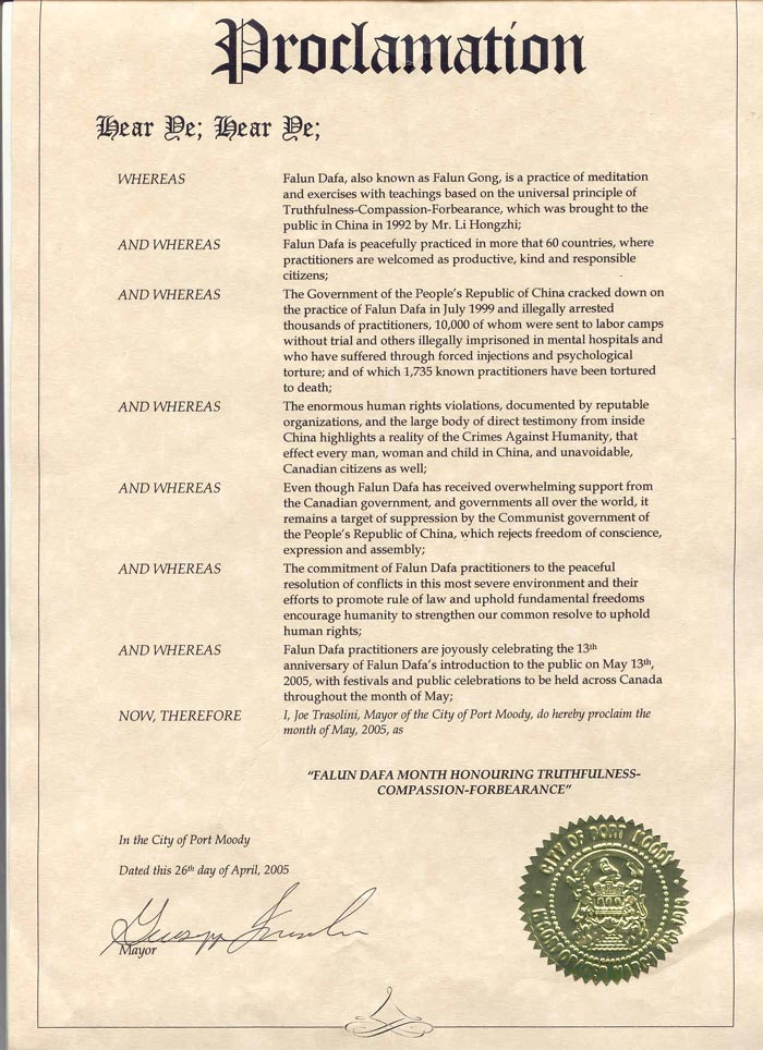 因此,我 Joe Trasolini满地宝市市长以此褒奖2005年5月为“法轮大法-真善忍月”。