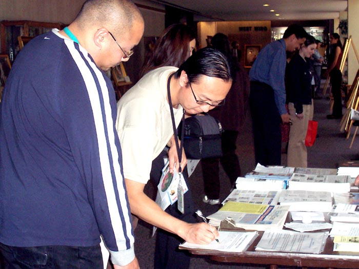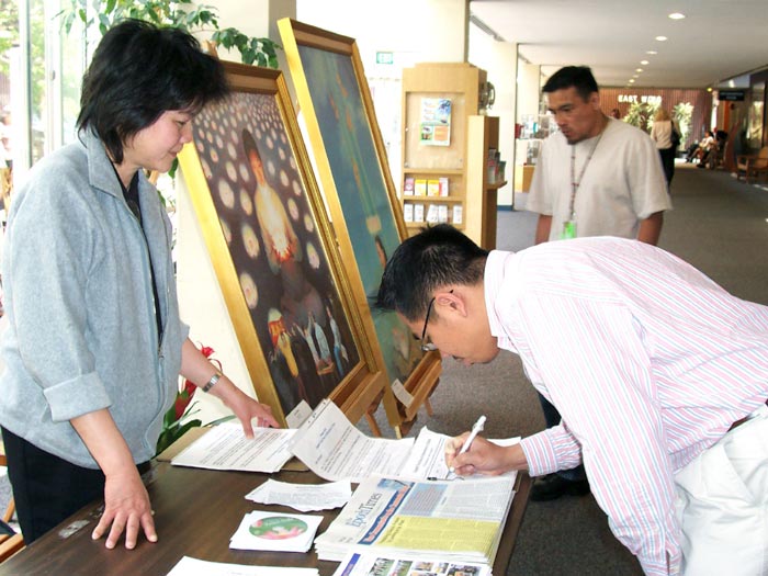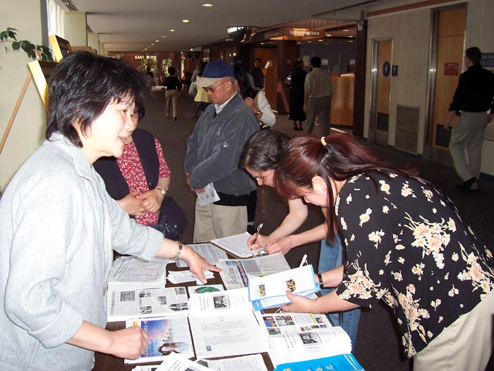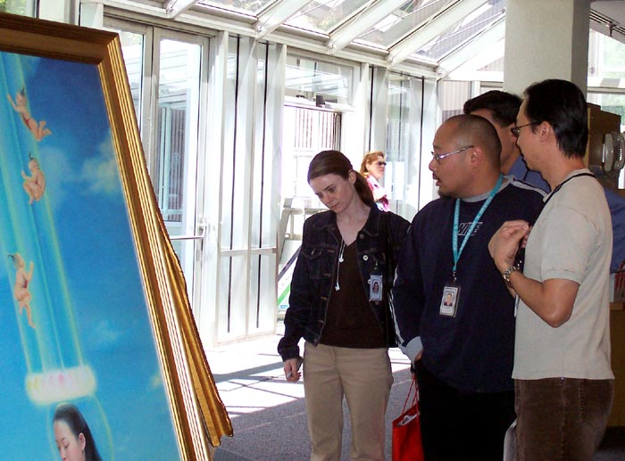 一幅展现36名来自西方十个不同国家的法轮功学员在天安门请愿的大型画面,吸引了不少民众驻足观看,主办单位的服务人员介绍,这是2001年11月发生在北京天安门的事,其中有多位法轮功学员来自圣塔克拉拉,他们有的是大学生、有的是工程师、也有公司的管理人员。他们也许是生活在我们周围不太引人注意的一员,然而正是这一个个平凡而普通的人用他们自己的血肉之躯,在过去的5年多里,筑起了一道让中共无法逾越的信仰长城。而他们巨大勇气的泉源,就是三个字“真、善、忍”。