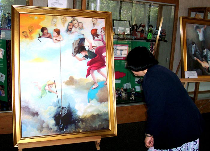 画展分为五个部份:“天上人间 佛光普照”、“同化大法返本归真”、“生命见证 正信永存”、“传播真象 呼唤正义”,以及“善恶有报 正义审判”;展出了由美国、日本等各国修炼法轮功的画家创作的30余幅油画和国画;详实逼真的把过去5年多来,世界各国、特别是在中国大陆的法轮功学员,面对中共的残酷迫害,不屈不挠的坚持自己的信仰,并理智、和平的,不间断的向社会各界讲清受迫害真象并呼唤正义良知的情形,淋漓尽致的展现在圣塔克拉拉县民众的眼前。