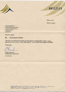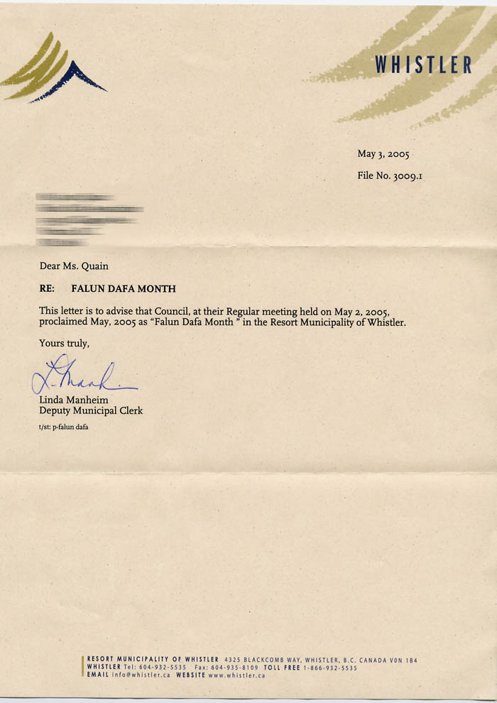 【明慧网2005年5月15日】2005年5月3日,加拿大不列颠哥伦比亚省威斯特勒市(Resort Municipality of Whistler)市议会致信加拿大法轮大法协会,褒奖2005年5月为“法轮大法月”。