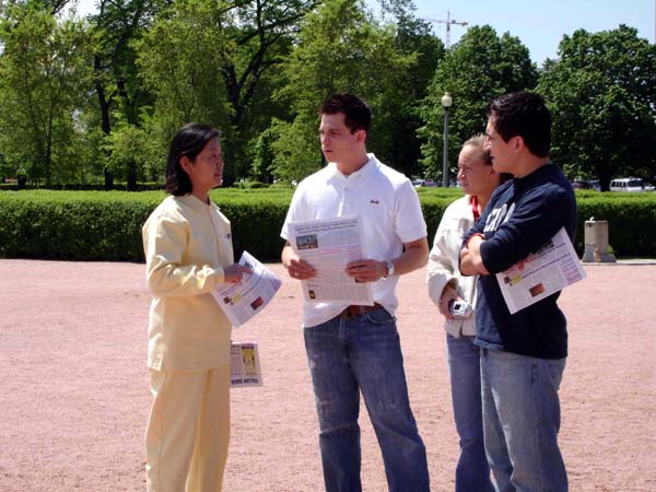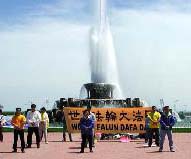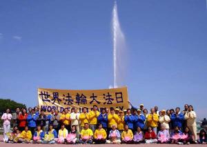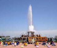 学员们在大喷泉前展开了一面巨大的“世界法轮大法日”的横幅,以及印有“法轮大法好”“世界需要真善忍”的小横幅,同时还向过往的行人展示了优美的五套功法。许多游人驻足观赏,了解法轮大法日的来历,更多的人纷纷拍照留念,记下这美好一刻。发资料的学员向感兴趣的游人介绍法轮大法的同时也讲述了在中国大陆发生着的迫害事实。
