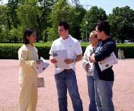 ![]() 学员们集体炼功 | ![]() 学员们集体炼功 | ![]() 学员向行人讲真象 |