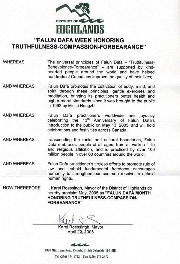 鉴此,我,卡瑞尔-若新(Karel Roessingh),海兰德区(District of Highlands)市长在此褒奖2005年5月为