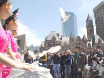 然后,法轮功学员们以放飞和平鸽的仪式,来表达对身处中国的大善大勇的法轮功学员的敬意。