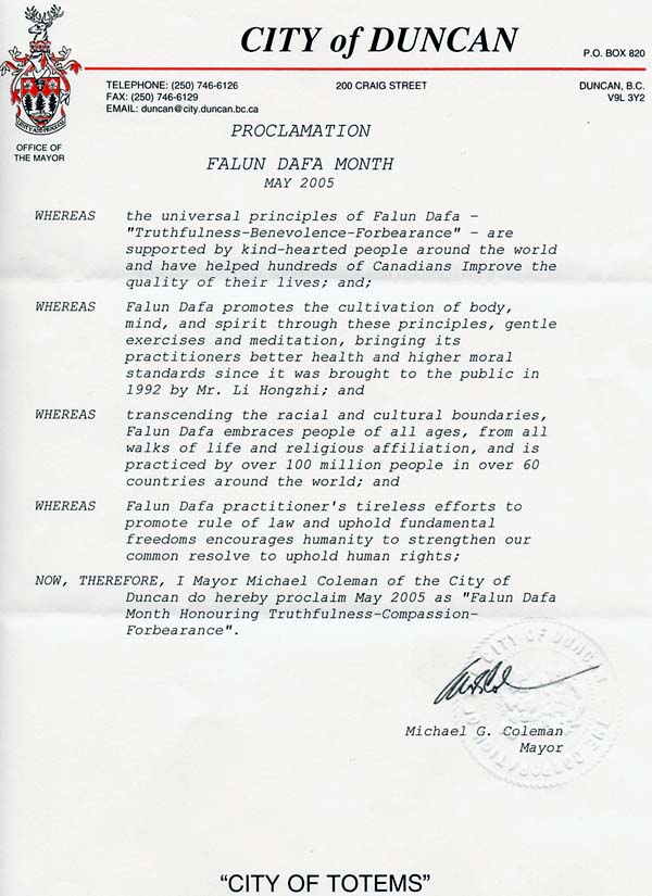 鉴于,法轮大法的宇宙法理“真、善、忍”受到全世界善良人们的欢迎,并帮助千百名加拿大人改善他们的生活质量;并且
