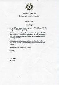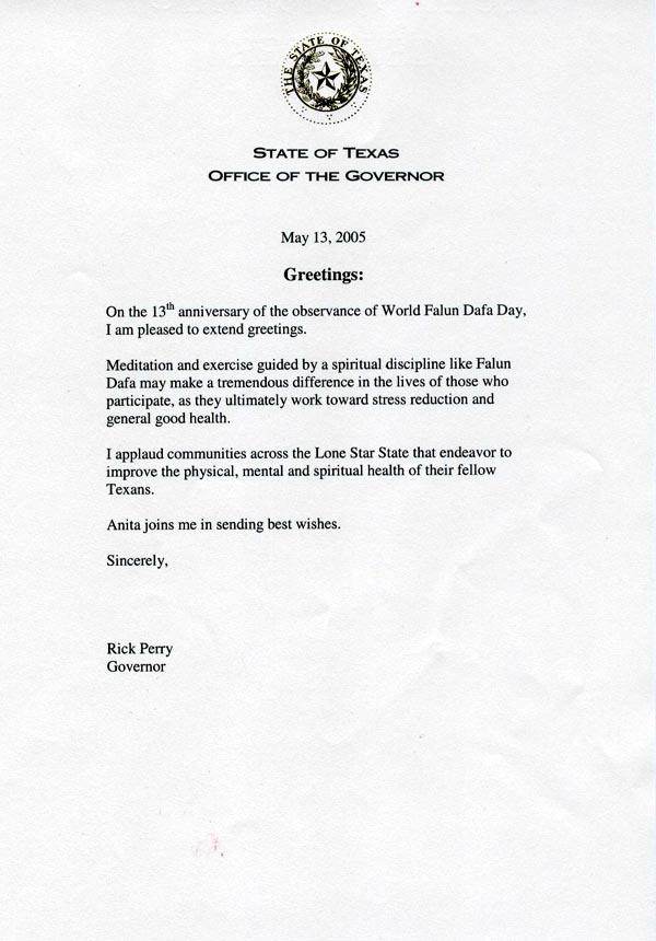 值此法轮大法(洪传)13周年暨庆祝世界法轮大法日之际,我很高兴向你们表达祝贺。在法轮大法这样的精神修炼指导下的打坐和炼功,可以使修炼者减轻压力,增進健康,从而使人生发生巨大的变化。