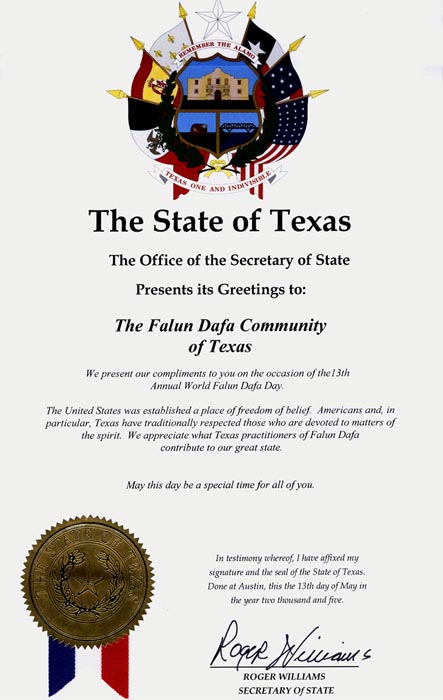 【明慧网2005年5月17日】5月13日,德州州务卿罗杰•威廉姆斯(Roger Williams)祝贺德州法轮功学员庆祝法轮大法日及法轮大法洪传13周年。全文如下: