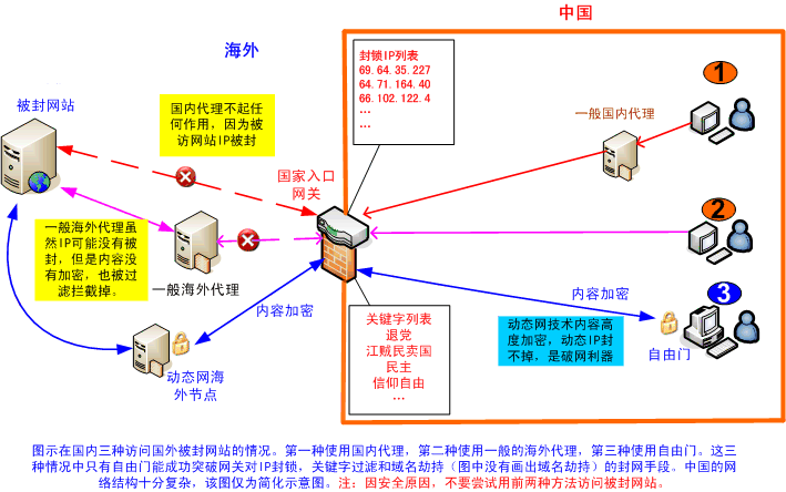 下图中显示了三种用代理访问海外被封网站的情况。第一个用一般国内的代理,第二个用一般的海外代理,第三个用自由门。对于网页浏览器(如IE或火狐FireFox)而言,使用自由门时自由门就是网页浏览器的代理,所有的数据流都是经过自由门加密后传输的,所以也叫加密代理。从图中可以看到,三种情况中只有自由门可以有效的突破网络封锁。