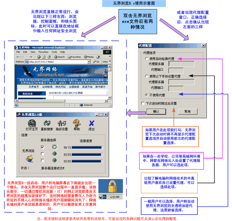 如果用以上的方法上了动态网,无界网络,或花园网络的网页后,很容易就可以下载三剑客提供的突破网络封锁的软件。这些软件最好在官方网站上下载,以防止坏人搞破坏。另外这些软件的名字可以改名,不要带有任何三剑客的名字迹象。这些小巧的软件都是绿色软件,即双击exe文件直接即可运行,无需安装,也不会改变系统设置。下面我们以无界浏览6为例,简要的说明有关的使用情况。其他的软件都有不同的使用情况,请参考软件自带的帮助文件。
