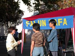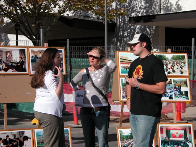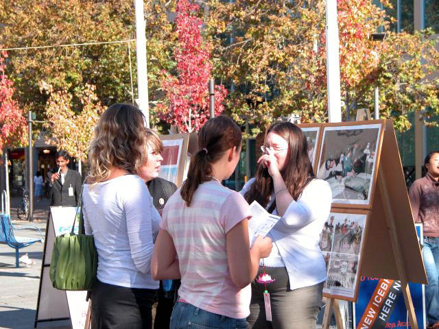 学员们向游人讲真象展览过程中,学员给许多人介绍法轮大法自1992年以来的洪传和在中国所受到的。观看展览的人们有的来自台湾、香港和加拿大,得以了解法轮功。有些年轻人在看了展览,了解到法轮功真象和在中国所受迫害之后,感动得流下了眼泪。