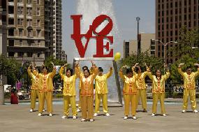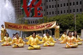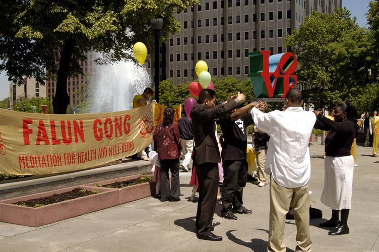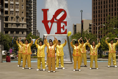 星期六,学员们来到费城著名旅游景点自由钟前炼功、发传单,向人们讲述着法轮大法的美好,以及在中国还在继续的迫害。