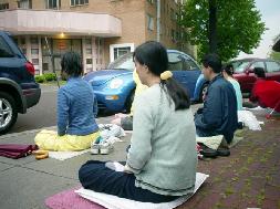 五月十五日上午学员们有的在市中心发真象报纸,有的在演示功法。过往的行人接过资料,并观看学员们炼功。其中有一位脚受伤,因疼痛行走不便的日本人,学着大家的动作跟着炼,一位日本人新学员,热心的教他动作,并给他介绍法轮功,那位男士认真的炼过第一套功法后竟能自然行走了。人们都赞叹法轮大法神奇。其实这样的故事在法轮大法修炼者中数不胜数。