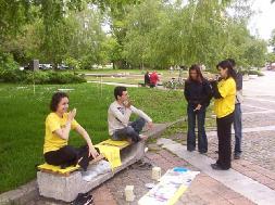 在Varna学员遇见一些已经炼功学法一段时间的民众,他们帮忙架设海报及派送传单。得知保加利亚有许多民众学炼法轮功的事实,学员们深受鼓舞。