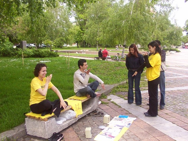 在Levski镇上,有些年轻人在学习静坐。他们决定要研读法轮功的书籍以及法轮大法最重要的一本书《转法轮》,这本书可由网路上免费下载或是在书店中购买。现场一共征集了约400位保加利及外国民众的签名呼吁终止在中国发生的对法轮功学员的迫害。