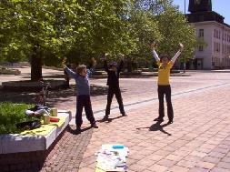学员也做了功法表演并向路人介绍法轮功。民众对修炼的益处很感兴趣并问了许多问题。许多人都是头一次接触到法轮大法。