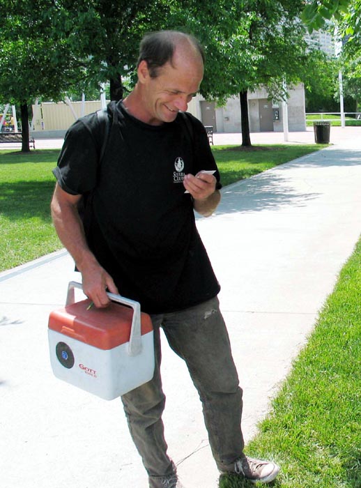 一市民很高兴得到法轮功资料,并询问炼功点。